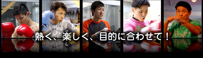 若者から元気なオヤジ、シニアまで幅広い世代が目標を定め、みんなが楽しく汗を流しています。 初心者ももちろん大歓迎。 キックボクシングは恐いイメージや厳しいイメージがあるかもしれませんが、会員さんの目的や目標をお聞きし、そこに合わせた練習をサポートします。 プロを目指す人、アマチュア大会出場を目指す人、仕事で成果を上げるため、健康維持、ストレス発散、ビールを美味しく飲むため、目的は何でもかまいません。 思いっ切り汗を流して、心も身体も真っ白になった時、新しい自分が見えてくるはず!!