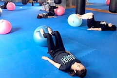 遊び感覚で体幹を鍛えるためのトレーニング。 いろいろなフォームでボールの上に乗ってバランスをとり、様々な部位の筋トレができます。 見た目以上にハードで、たっぷり汗が出ます。